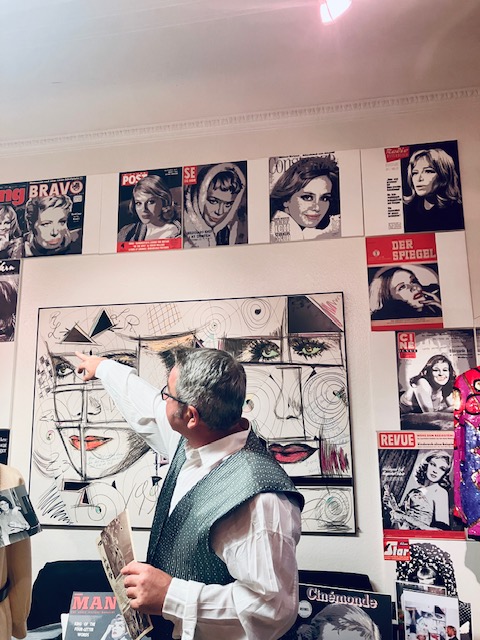 Wir sind 9 Besucherinnen und 1 Besucher. Aufmerksam beantwortet Christian Fragen, erzählt Anekdoten und passt diskret auf, dass niemand die Objekte anfasst, die nur zum Anschauen da sind. Darunter: ein von Knef gemaltes Bild eines Tümpels im Hundeauslaufgebiet Grunewald, das marshmallowfarbene Kostüm, mit dem sie 1977 ihren dritten Gatten standesamtlich ehelichte, ein halbes Dutzend Strohhüte der Diva („wenn sie mit einem Hut einmal fotografiert worden war, trug sie ihn in der Öffentlichkeit nicht mehr“) sowie ihre enormen künstlichen Wimpern, von denen sie, wie wir erfahren, bis zu einem bestimmten Zwischenfall immer nur ein einziges Paar dabei hatte. Riechen darf man am alten Parfüm der Knef („natürlich längst gekippt“).