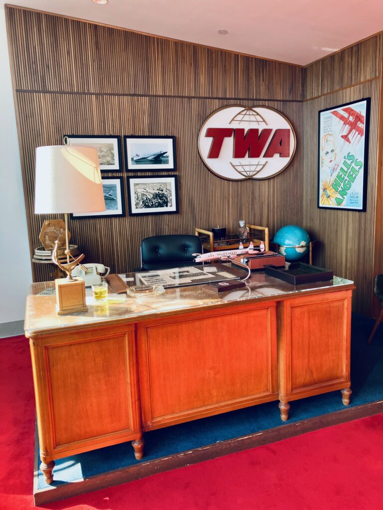 Von der Lobby kann man mit einem Aufzug direkt ins Abflugterminal 5 fahren, wo man nochmal die Security passieren muss. Bevor einem der Aufzug in die Gegenwart katapultiert, kann man einen kleinen Stopp am originalen Schreibtisch von Howard Hughes einlegen, der hier lässig und zum Anfassen nah ausgestellt ist. Allerdings ist der Bourbon im Glas auf dem Schreibtisch aus Plastik. Genug von alten Zeiten geträumt. Wir sind schließlich im Amerika des 21. Jahrhunderts.