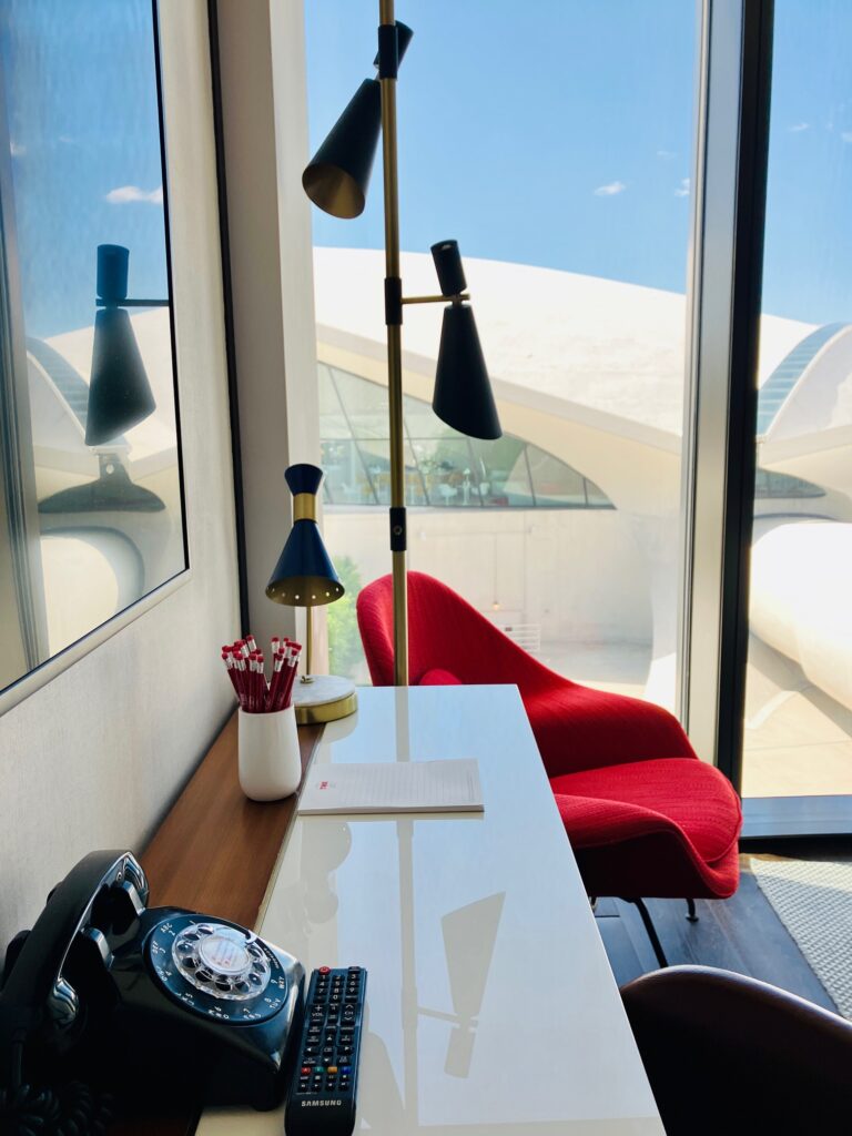 In der spektakulären Lobby kann man sitzen, Kaffee trinken und die Architektur bewundern – kostenlos und auch, wenn man nicht in einem der über 500 Zimmern wohnt, die nun in dem Gebäude untergebracht sind. An diversen Orten des öffentlichen Bereichs sind Artefakte und Baupläne aus der großen Ära der TWA ausgestellt, es gibt Bars, Konferenzräume, ein Fitnessstudio und einen bezaubernden Friseursalon, nicht ganz stilecht für Saarinens kühle Moderne, aber doch irgendwie artverwandt im Stil einer zuckerwattensüßen Sixties-Ästhetik gestaltet. Die Rezeption ist dem historischen Check-In-Bereich nachempfunden, und man sieht vor seinem inneren Auge sofort Don Draper aus Mad Men hier seine Bordkarte in Empfang nehmen. Im gesamten Gebäude sind Dekorationsstücke aus dieser Epoche verteilt, die Vintage-Fans ebenso wie Architekturkenner aus dem Häuschen bringen.