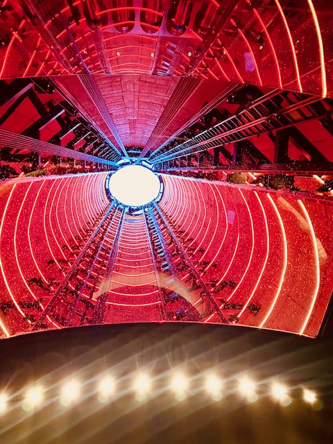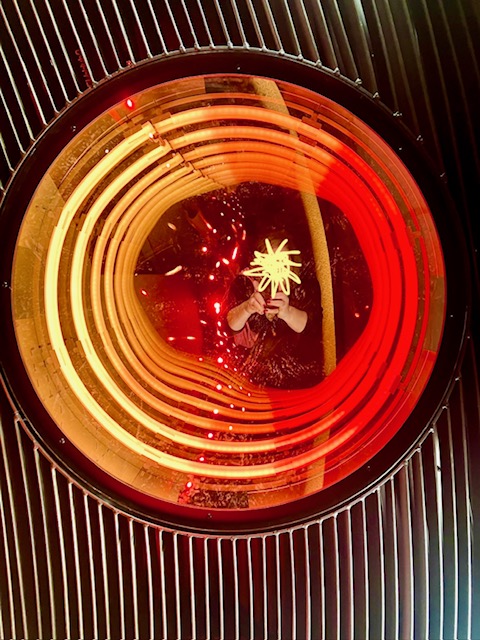 Kaum war die kleine Lichtshow erloschen, wies der Guide die kleine Liftfahrreisegruppe in die Aufzüge, die sie kurz danach in einem kleinen Wendeltreppengang ausspuckte, der mit bunten Neonröhren beleuchtet war. Der Weg zum eigentlichen Lift. Wieviel Brimborium ist noch nötig, bis man da hochfahren und runtergucken kann? „Seid ihr bereit“, fragte der Guide, und schob uns in eine runde, gläserne Fahrstuhlkabine. Na, endlich.