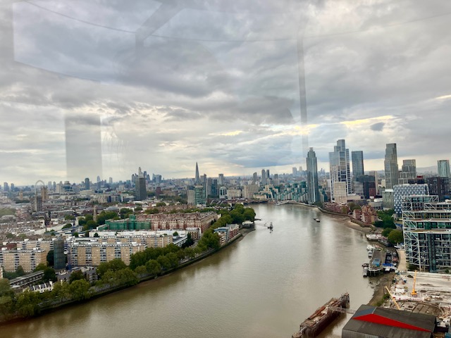 Im Schlot selber hatten wir die Durchsichtigkeit des Fahrstuhls wahrgenommen, sie aber dahingehend interpretiert, dass man das extra Beleuchtete im Innern sehen soll. Die Antriebstechnik und Halterung des Fahrstuhls war aber unter dem Boden des Fahrtstuhls befestigt, so dass er mit seinem Glaszylinder, in dem wir uns befanden, einfach über den Rand hinausfahren konnte. Wir genossen die Rundumsicht auf London, die Themse und das unter uns liegende Battersea. Bis dass der Fahrstuhlführeraufzugsleiter uns mitteilte, dass wir in Kürze wieder runterfahren. Der Fahrstuhl zog sich wieder ins Innere des Schlotes zurück. Die Lichter blinkten nicht mehr ekstatisch, sondern funzelten nur trübe, als ob sie sich von uns verabschieden wollten. Wir hatten unseren Höhepunkt gehabt und unten spuckte uns der Eventfahrstuhl wieder ins normale (für uns: immerhin) Londoner Leben aus. Die Reiserin strahlte. „Na siehste“, sagte HerrBert. „Auch das 21. Jahrhundert hat ja manchmal was.“ (September 2023)