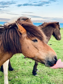 Hier füttert Herr Bert ein Islandpony (Island, Álftanes, Juli 2021).
