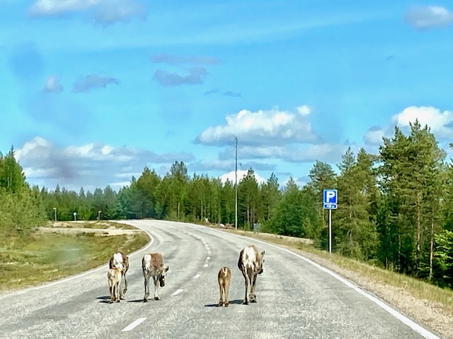 Die Straße war leer, jedenfalls was Autos betraf. Doch der HerrBert nahm den Fuß trotzdem nicht von der Bremse. Es waren nämlich ziemlich viele Rentiere unterwegs. Gemächlich trotteten sie auf der Fahrbahn vor uns her oder kamen uns entgegen. Eines davon war weiß, und als die Reiserin es ansah, schaute es zurück. Sie wurde blass. „Die Sami sagen, ein weißes Rentier, das einen anschaut, überbringt eine Nachricht“, das wusste sie als Finnlandfan. „Hoffentlich ist es etwas Gutes.“