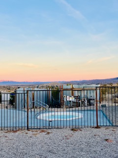 Die Anlage ist bezaubernd altmodisch. Sie besteht aus niedrigen, langgestreckten Bungalows, der Garten davor von der neuen Besitzerin liebevoll mit allerlei Tierfiguren und Lichterketten geschmückt. Der Blick aus den Zimmern geht auf die Wüste, die im Tal liegende Ortschaft Twentynine Palms – und auf einen Pool mit Hot Tub. Letzterer sei erst um 18 Uhr richtig warm, lässt uns die resolute Besitzerin wissen. Das stört uns nicht, wir setzen uns vor unser Zimmer und gucken fasziniert zu, wie sich der Himmel in breite hellblaue und rosarote Flächen auffächert, bevor die Sonne dann zügig untergeht.