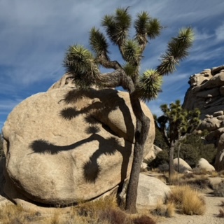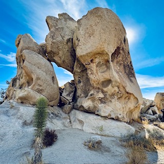 Die knuffigen Felsformationen erinnern HerrBert an seine Kletterzeit im Elbsandsteingebirge, wo es ähnliche, wenn auch höhere und steilere Formationen gibt. Auch im Joshua Tree-Nationalpark wird geklettert: Manche Touristen springen leichtfüßig wie die Bergziegen auf die Felsen, um oben Selfies zu machen, andere rüsten sich mit Seil und Haken für den Aufstieg von höheren Felsen.