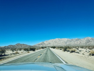 Wir fahren durch die Mojave-Wüste in Richtung Norden und dann östlich nach Las Vegas. Lange führt unser Weg durch leeres Gelände, wo nur ein paar Büsche wachsen. Der Horizont ist weit entfernt, begrenzt von Bergketten. Irgendwann sind auch die Büsche weg. Das findet die Reiserin merkwürdig und sie guckt nach. Noch gibt es Netz. „Ausgetrockneter Salzsee“, sagt sie. „Hier wird Salz produziert“. Tatsächlich sehen wir jetzt hin und wieder ein paar kleine Fabrikgebäude.