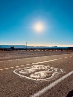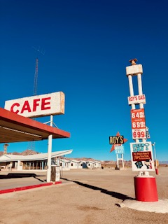 Irgendwann kommt etwas in Sicht, das wie eine spärliche Wohnsiedlung aussieht – und eine uralte Tankstelle. „Amboy“, sagt HerrBert. Die einzige Ortschaft weit und breit, bekannt für die wahrscheinlich letzte Tankstelle der USA, wo noch ein Tankwart am Werk ist – oder in diesem Fall eine Tankwartin. Hier sind wir auf der Route 66 – die John Steinbeck in seinem Roman „Früchte des Zorns“ als „Mutter aller Straßen“ bezeichnete.