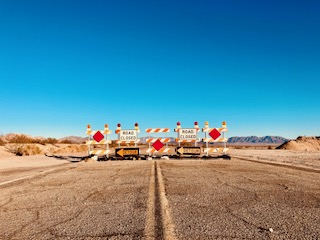 Wir wollen ebenfalls weiter, denn bald geht die Sonne unter und der Weg nach Las Vegas ist noch weit. Kurz nach Amboy ist die Route 66 abgesperrt und eine Umleitung auf einer kleineren Straße ausgeschildert. Frau Reiserin hechtet aus dem Auto, um das „Detour“-Schild zu fotografieren. Ist ja unser Motto: Umwege erhöhen die Ortskenntnis.