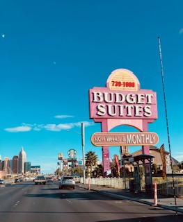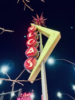 Erst eine halbe Stunde später, als wir aus den Bergen kommend in die Talsenke der Wüste runterfahren, präsentiert sich erneut ein flaches, diesmal riesiges Lichtermeer: Las Vegas. Wir begrüßen es mit allen Versionen von „Viva Las Vegas“, die wir in unseren Playlists finden können. Angefangen bei Elvis, über Nat King Cole zu den Dead Kennedys und schließlich zu Nina Hagen.