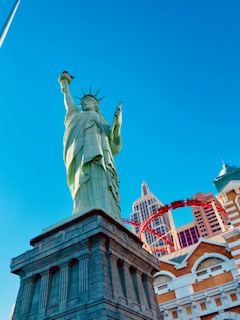 Am nächsten Tag stürzen wir uns auf den Strip, wie der Las Vegas Boulevard genannt wird. Hier reihen sich die großen Resorts und Casinos aneinander. Die Reiserin findet heraus, dass man beim Hotel „Circus Circus“ am nördlichen Ende des Strips umsonst parken kann. Von dort nehmen wir den Bus, der rund um die Uhr den Strip rauf und runter fährt. HerrBert möchte als erstes zum „New York New York“ am südlichen Ende, das wir auf der Herfahrt gesehen haben. Ein gigantisches Hotel-Casino, das aus lauter nachgebauten Wolkenkratzern und einer Imitation des Empire State Building besteht – und durch dessen Lobby eine Achterbahn fahren soll.