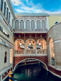 Jedes Resort und Casino am Strip hat ein anderes Thema. Vor dem New York steht eine Kopie der Freiheitsstatue und eine Andeutung der Brooklyn-Bridge. Vor dem „Bellagio“ liegt eine Miniaturversion des Comer Sees, wo alle Viertelstunde ein Ballett aus Wasserfontänen gezeigt wird. Direkt gegenüber liegt „Paris“ mit einem Nachbau des Eifelturms. Im „Venetian“ ist im Innenraum nicht nur ein ganzes, funktionierendes Brücken- und Kanalsystem inklusive von singenden Gondolieri gelenkter Gondelbooten angelegt, sondern es gibt auch einen Nachbau des Markusplatz, über den man flanieren kann. Über allem spannt sich ein blauer Himmel mit weißen Tüpfelwölkchen und einem Licht, das irgendwo zwischen Nachmittag und Abenddämmerung eingestellt ist. Die Wolkendecke ist künstlich, die Truman-Show lässt grüßen.