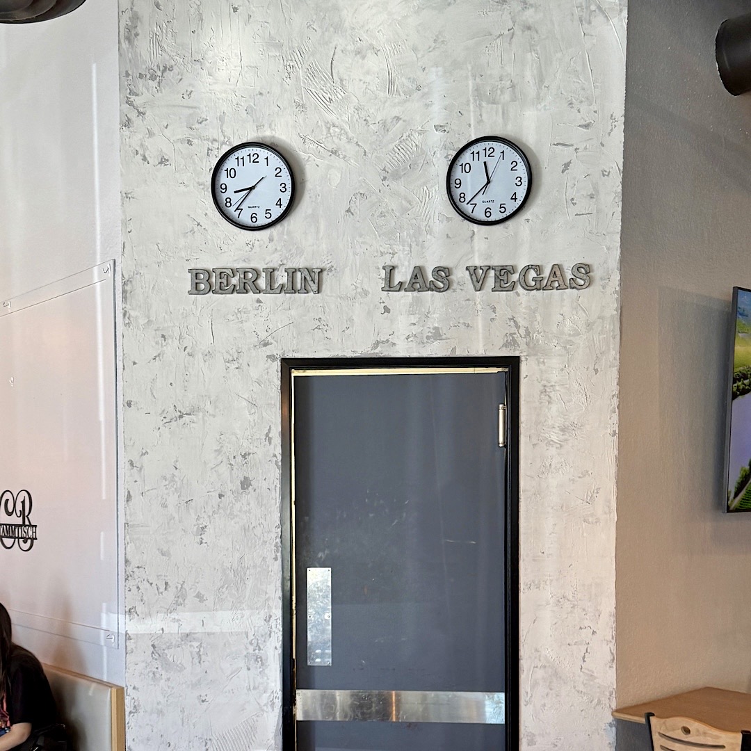 Wir werfen noch einen Blick in die Speisekarte und in den Raum. Dort hängen zwei Bilder, die definitiv nicht Berlin zeigen, sondern Köln mit seinem Dom und auf dem anderen eine für HerrBert nicht auzumachende Stadt. Außerdem eine stilisierte Deutschlandkarte. Eine zweite Uhr zeigt neben der hiesigen Zeit die Berliner Zeit. Das war es auch schon mit dem deutschen Ambiente. Anders die Speisekarte. Alle Speisen sind deutsch betitelt und die Auswahl reicht von „Nuernberger Rostbratwuerst’l“ über Frikadellen bis hin zum unguten Zigeunerschnitzel. Hier darf das böse Wort noch unbeschwert sein Unwesen treiben, sich auf die Speisekarte drängeln, im Gegensatz zu heimischen Gefilden, wo es ein Dasein am Rande des Wortfriedhofes fristet.