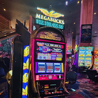 Nach dem Essen geht’s los. Kichernd setzen wir uns an einen einarmigen Banditen und HerrBert füttert ihn mit dem ersten Dollarschein. „Um zu gucken, wie es funktioniert“. Aha, man muss auf „Play“ drücken, dann beginnen in drei Reihen die Zahlen zu wirbeln. Mit einem Tipper an den Arm des Banditen bringt man sie zum Anhalten, wobei sie eine möglichst einheitliche Reihe ergeben müssen. „Sind doch drei 7“ jubiliert die Reiserin etwas vorschnell. „Ja, schon“, sagt HerrBert. „Aber sie müssen auch dieselbe Farbe haben.“ Hm, also neuer Versuch. Er setzt einen Fünfer, tippt ein wenig – und das Guthaben springt von 3 auf 15 Dollar! Ein paar Mal daddeln wir uns noch warm, am Ende nehmen wir den Gewinn mit – einen 10 Dollar-Bon, den die Maschine ausspuckt. Damit haben wir unseren Einsatz mehr als rausbekommen.