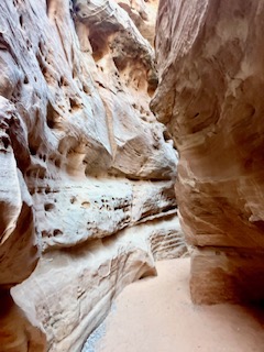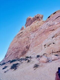 Geradezu euphorisch klettert die Reiserin, normalerweise nicht die motivierteste aller Berggängerinnen, in Richtung „Elephant Rock“, der ersten mit einem kleinen Rundwanderweg zu erkundende Felsformation. Aus direkter Nähe wirkt der zerklüftete Stein noch tiefroter, der Himmel noch unnatürlich blauer. Die Sonne ist warm, aber nicht heiß. Der Weg ist steinig, aber nicht steil. Nach einer halben Stunde sind wir wieder am Startpunkt des kleinen Rundwanderwegs angekommen. Die Begeisterung der Reiserin hält auch noch an, als wir nach der Fahrt durch den Park den nördlichsten Punkt namens „White Rock“ erreichen – zusammen mit ungefähr zwanzig Chinesen, die für ein Foto alle gleichzeitig in die Luft springen. Hier führt ein kleiner Sandweg erst in eine Talsenke und dann durch enge, märchenhaft geschwungene Felswände wieder zurück. Diesmal alles in Hellrosa.