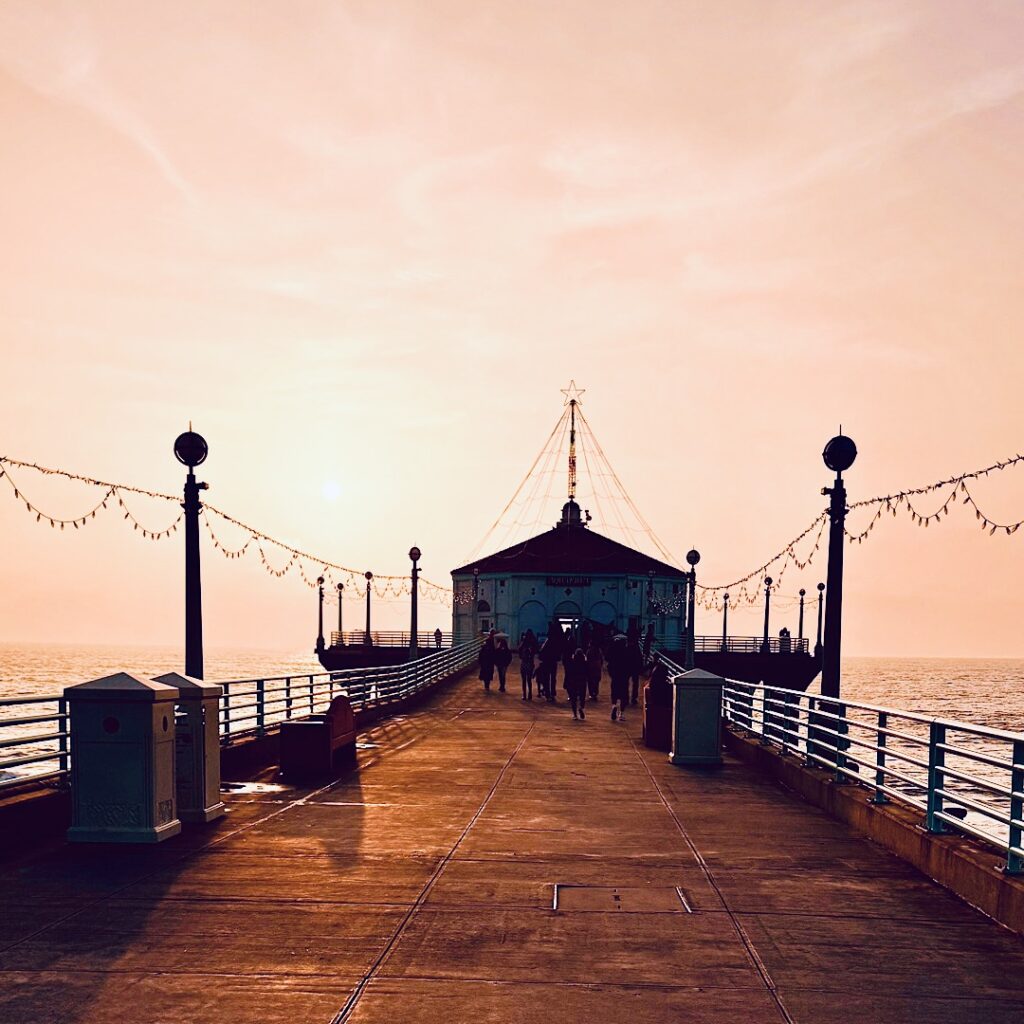 In Manhattan Beach hing der pinke Ballon knapp über dem Horizont. Alles war wie mit Pastell gemalt, die kalte Luft pfiff, wie es sich für kurz vor Neujahr gehört. „Den Pazifik haben wir noch nie gemeinsam gesehen, oder?“ pfiff Frau Reiserin zwischen klappernden Zähnen hervor. Kurz stapften wir romantisch frierend ans Ende des Manhattan Piers. Imposante Wellen pflügten herbei und ein unerschrockener Surfer ritt auf ihrem Kamm.