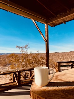 Als HerrBert in der Nacht kurz wach wird, pfeift der Wind um den Wüstenbungalow. Er pfeift auch noch, als die Sonne ihn später durch das Bungalowfenster an der Nase wachkitzelt. Unsere Unterkunft ist nämlich so eingerichtet, dass man vom Bett aus direkt auf die Wüste sieht, und früh nur ein wenig den Kopf drehen muss, um auch den Sonnenaufgang vom Kopfkissen aus mitzubekommen. Als HerrBert auf die Terrasse tritt, um den Tag zu begrüßen, zerzaust der Wind ihm die Haare. Er geht einmal ums Eck auf die andere Terrasse und schwupps: windstill und Sonnenschein. Hier kann man den Morgenkaffee in Ruhe genießen.