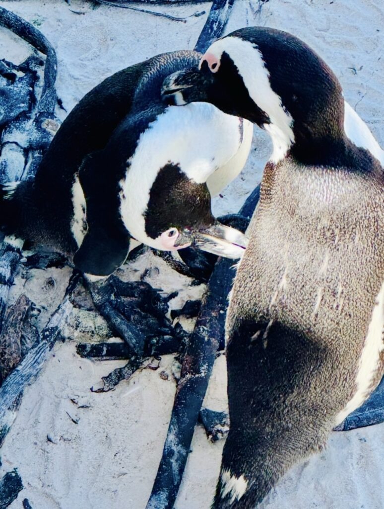 Da sind sie nun, die afrikanischen Pinguine, sie sind die Florida Boys and Girls unter den Pinguinen. Man findet Kolonien im Süden Afrikas von Mosambik an der Ostküste bis Angola im Westen. Auch 120 km weiter in Betty’s Bay gibt es eine weitere Kolonie, aber das wird wohl nur die andere Hälfte der zerstrittenen Familie aus Boulder Beach sein… . Jedenfalls ist es hier viel gemütlicher als in der Antarktis, die Pinguine frieren sich in Südafrika nicht während einer monatelangen kalten Dunkelheit ihren Allerwertesten ab, wie ihre hartgesottenen Artgenossen um den Südpol herum.