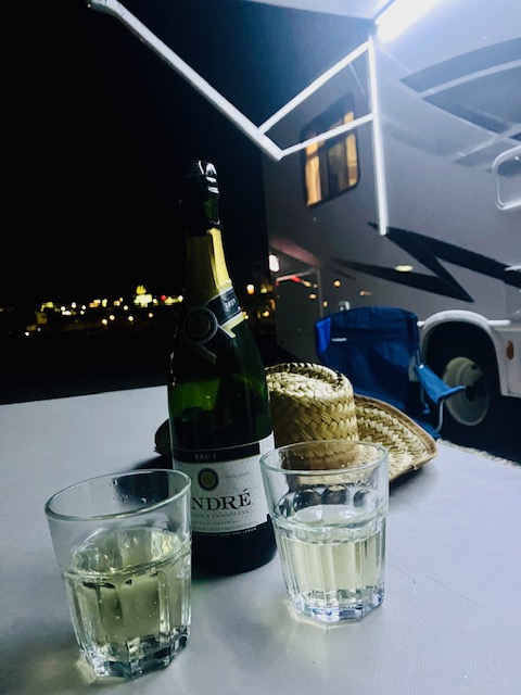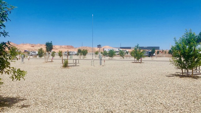 Heute haben wir nochmal so richtig gewohnt. Der Stellplatz, wo wir gestern in Mesquite angekommen sind, entpuppt sich als moderne, sehr saubere und fast leere Kiesfläche, rhythmisch gestaltet mit wenigen kargen, jungen Bäumchen, die jeden Abend genau eine Viertelstunde lang künstlich bewässert werden. An jedem Stellplatzeingang weht ein kleines Amerikafähnchen, in der Ferne rauscht die Autobahn und außer unserem sind nur sehr wenige Plätze besetzt. Von frühmorgens an bratzt die nevadische Wüstensonne herunter, und reflektiert auf den hellgrauen Straßen so hell, dass man sich fühlt wie von einem Scheinwerfer angeleuchtet. Die Szenerie ist fast menschenleer, und als die Reiserin heute Vormittag zum Duschhaus ging, kam sie sich vor wie in einem Gemälde von Edward Hopper. Sie war begeistert.