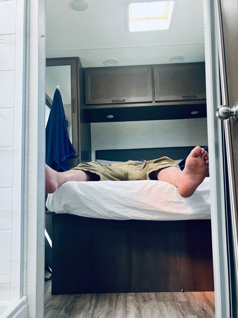 HerrBert hörte derweil Hörbuch. Diesem Vergnügen gibt er sich tagsüber nur sehr selten hin, aber heute war es soweit. Es ist unser letzter Tag mit dem Straßenbär und es macht Spaß, mal keine Pläne zu haben, sondern für einmal richtig zu wohnen. Weil es draußen ab Mittag gegen vierzig Grad hatte, warfen wir die Klimaanlage an – interessanterweise kann sie lediglich elf Grad Celsius kühler kühlen als die Außentemperatur. Aber immer noch besser als nichts.