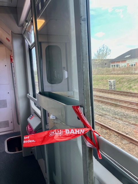 Das Wasser kühlt kein bisschen. Die junge Frau geht kurz raus. „Am Fenster geht es“, sagt sie. Und tatsächlich, jenseits der altmodischen Klapptür, die den Gang mit den Abteilen vom Eingangs- und WC-Bereich des Wagens trennt, gibt es auf beiden Seiten des Wagens je ein kleines Fenster, das sich aufklappen lässt. Die Reiserin hat eine Idee. „Hast du Strippe dabei?“, fragt sie HerrBert, der neben ihr in kontemplativer Ruhe sitzt und sich nicht von der Aufregung anstecken lässt. „Hä?“, fragt er. Wenn die Reiserin Ideen hat, schätzt er die Anmoderation. Aber dafür ist jetzt keine Zeit. „Strippe“, wiederholt sie. „Schnur. Damit man die Tür an beiden Enden öffnen und festbinden kann.“ Dann zieht es durch den Gang und das senkt vielleicht ein bisschen die Temperatur in den Abteilen. „Hm“, HerrBert ist skeptisch. Ist doch viel zu kompliziert. „Da packste unten einen Stopper rein“, sagt er. Die Reiserin ist beeindruckt. Stimmt, ist viel einfacher, bringt dasselbe Resultat, und ist zur Not auch mit einem alten Taschentuch zu machen.