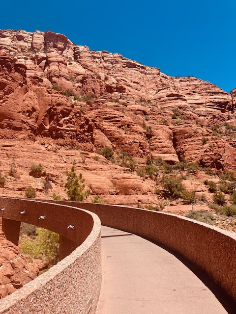 HerrBert hatte unterdessen schon routiniert den Frischwassertank gefüllt, den Abwassertank geleert und den Straßenbären vom Stromnetz genommen. Es ging los in den neuen Tag! Als erstes wollten wir uns die architektonisch spektakuläre, weil im modernistischen Betonstil direkt in den Fels oberhalb von Sedona hineingebaute Chapel of The Holy Cross ansehen. Die Frage war nur: Wie? Beziehungsweise: Wo bleibt der Straßenbär so lange? Denn drei Dinge gingen aus den diversen Beschreibungen dieser Sehenswürdigkeit hervor: 1. Wer diese Kirche nicht gesehen hat, hat Sedona nicht gesehen. 2. Wer mit einem RV unterwegs ist, hat ein Problem, weil es für sie nirgendwo in der Nähe der Bergkirche Parkplätze gibt. 3. Egal wo man parkt, der Aufstieg zur Kirche ist so anstrengend, dass zwischen Parkplatz und Eingang kleine Golfmobile verkehren, die die Besucher nach oben bringen.
