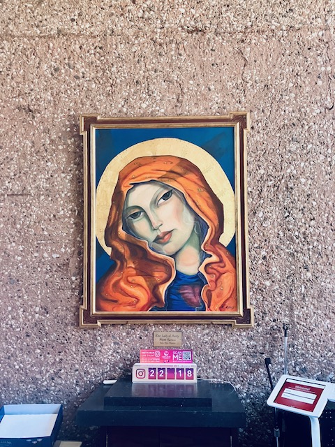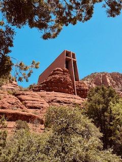 Der kleine Kirchenbau, 1956 eröffnet, ist spektakulär. In perfekter Harmonie in die Landschaft gebaut, hinter dem Altar nur eine Glasscheibe, durch die man auf die roten Felsen von Sedona sehen kann. Während HerrBert sich nach ausführlicher Betrachtung wieder ins Freie setzte, begab sich die Reiserin in den Geschenkshop im Untergeschoss, wo sie, obgleich sowas von nicht katholisch, diverse Heiligenbildchen und Amulette gegen allerlei Gebrechen erwarb.