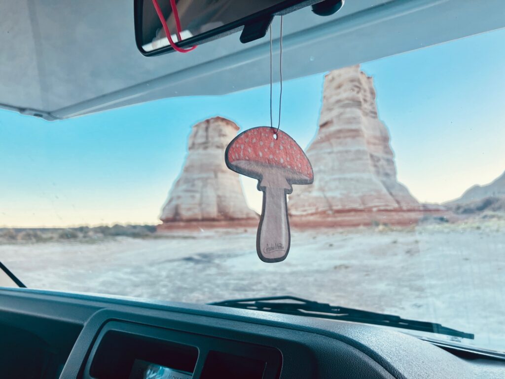 Dann ging es nach Downtown Sedona, das hier Uptown heißt. Entlang der Hauptstraße sind Geschenk- und Klamottenläden sowie Restaurants aufgereiht, und zwar so, dass man einmal auf jeder Seite an allen entlanglaufen muss, weil man nur an wenigen, vorgesehenen Stellen die Straße überqueren kann – eigenmächtiges Abbrechen der Shoppingroute wird durch eine durchgängige Sperre in der Mitte der Straße verhindert. Wir fügten uns und klapperten die üblichen Geschäfte ab. Die Reiserin erwarb einen Autobedufter in Fliegenpilzform. Seither riecht der Straßenbär nach Moschus.